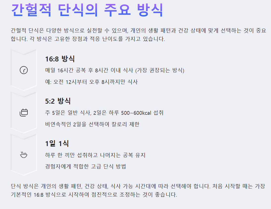 ✅ 팁: 16:8 방식은 매일 반복하기 쉬워 입문자에게 가장 추천되는 간헐적 단식 방식입니다.