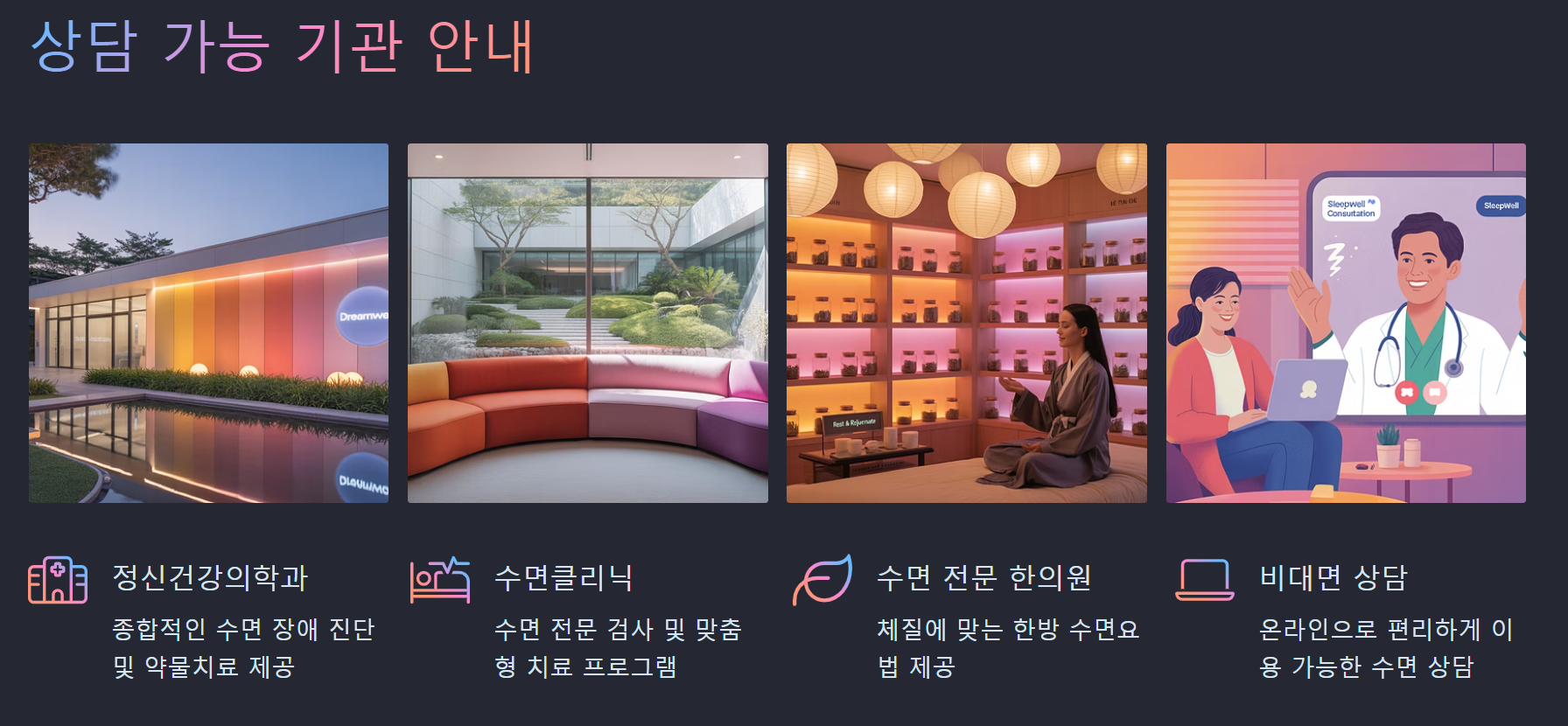 A. 정신건강의학과, 수면클리닉, 한의원 등에서 상담 가능하며, 최근엔 비대면 수면상담도 활성화되고 있습니다.