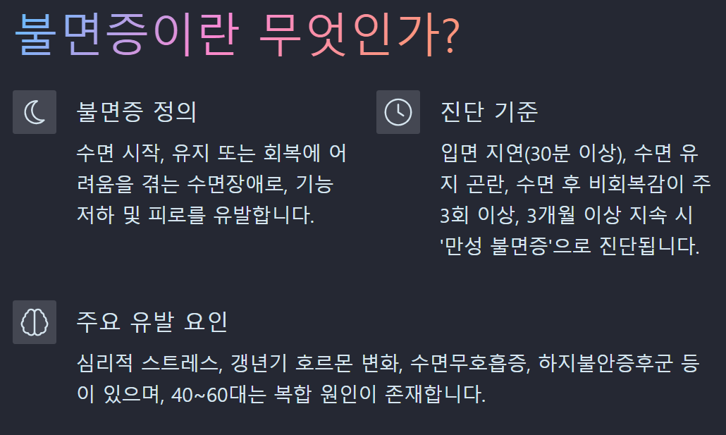 ✅ 스트레스, 불안장애, 갱년기, 수면무호흡증, 하지불안증후군 등 다양한 요인과 연결됩니다